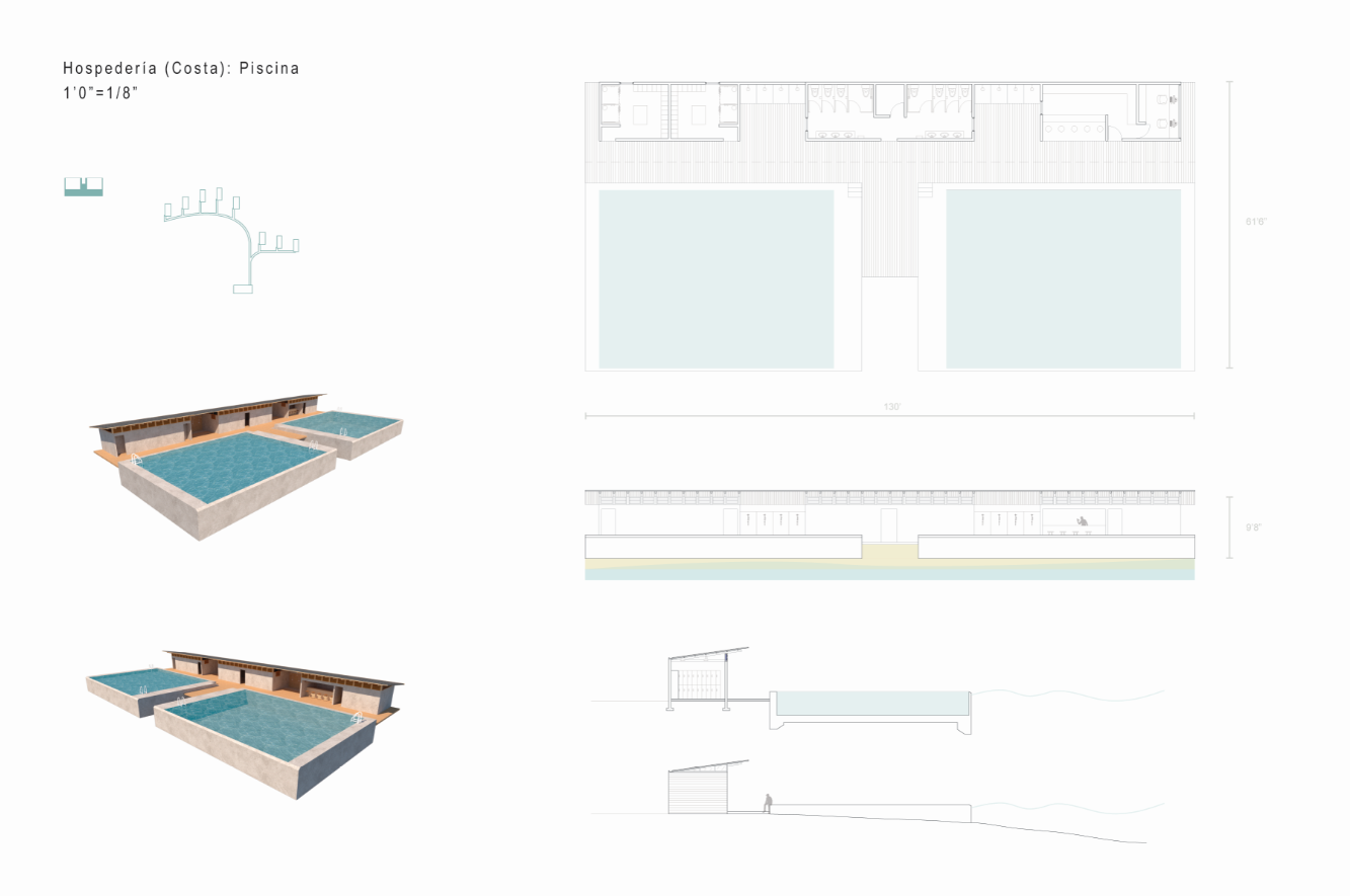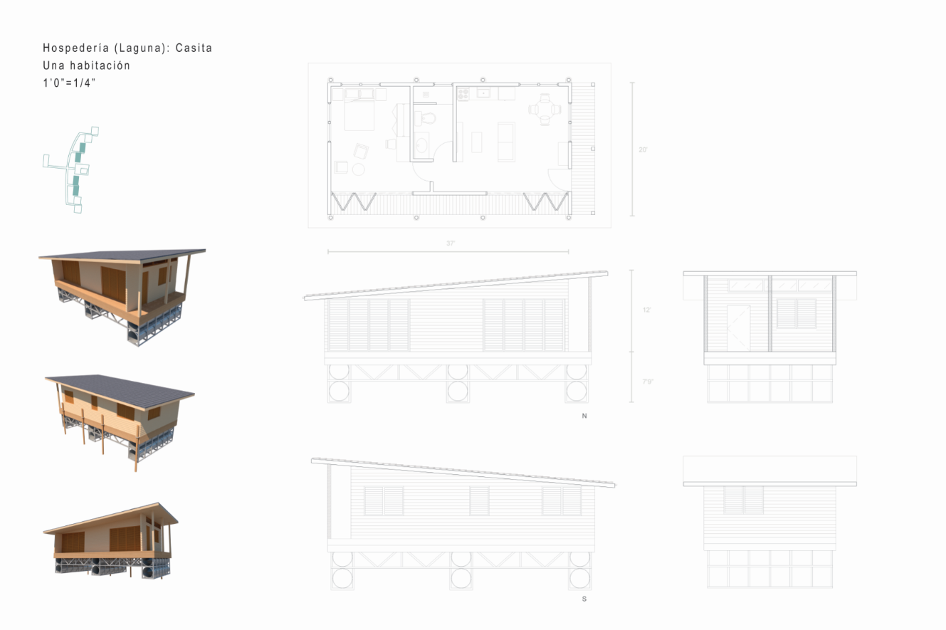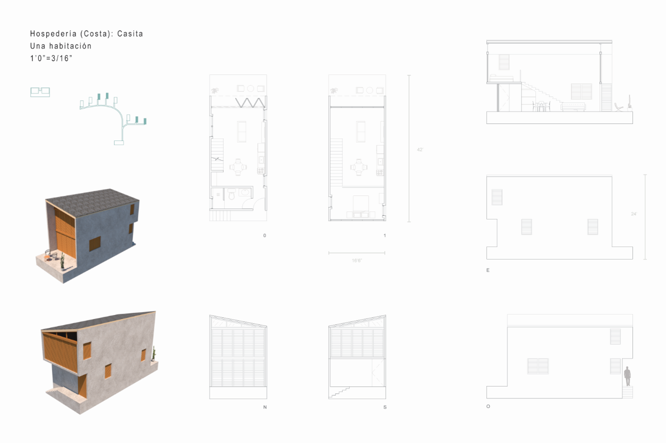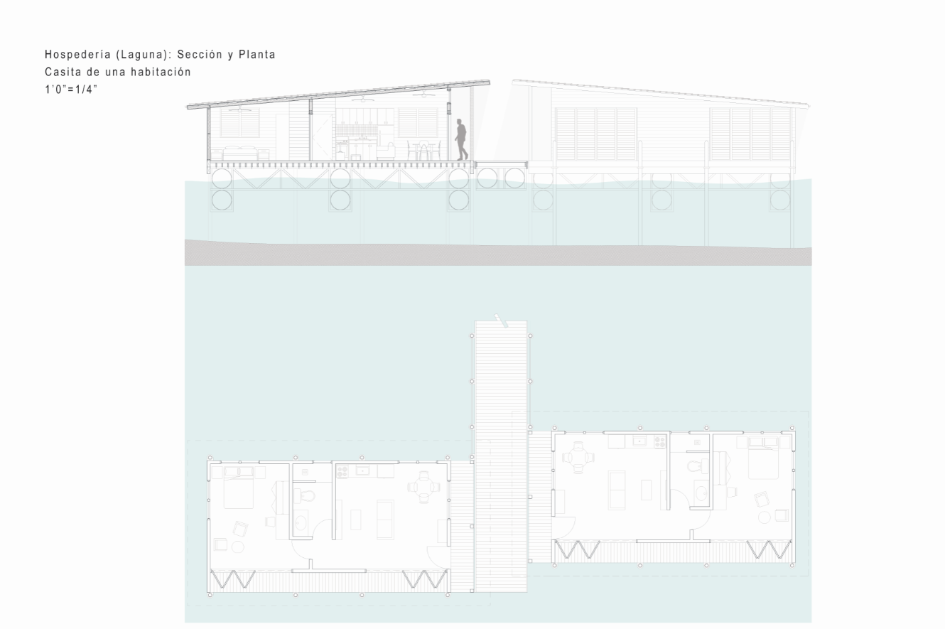 With the intention of proposing spaces that would entice tourists to visit the coastal town of Loíza in Puerto Rico and explore its natural wonders, I designed two short-term lodging projects. These Casitas can be rented out to tourists who want to experience nature up-close, and are accompanied by natural pools. The first project sits deep in the Piñones Mangrove Forest, where wooden tiny houses are floating anchored to a dock at the Piñones Lagoon, where visitors can kayak right from their front deck. The second project is located right on the north coast in Punta Maldonado, where minimalist concrete two level houses overlook the ocean, and a pool area is found right on the water.
