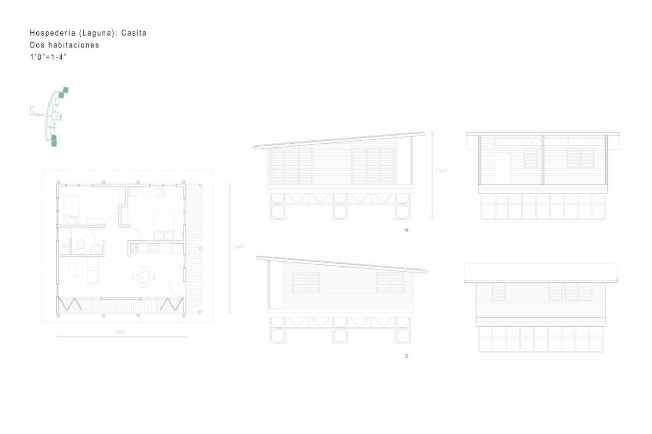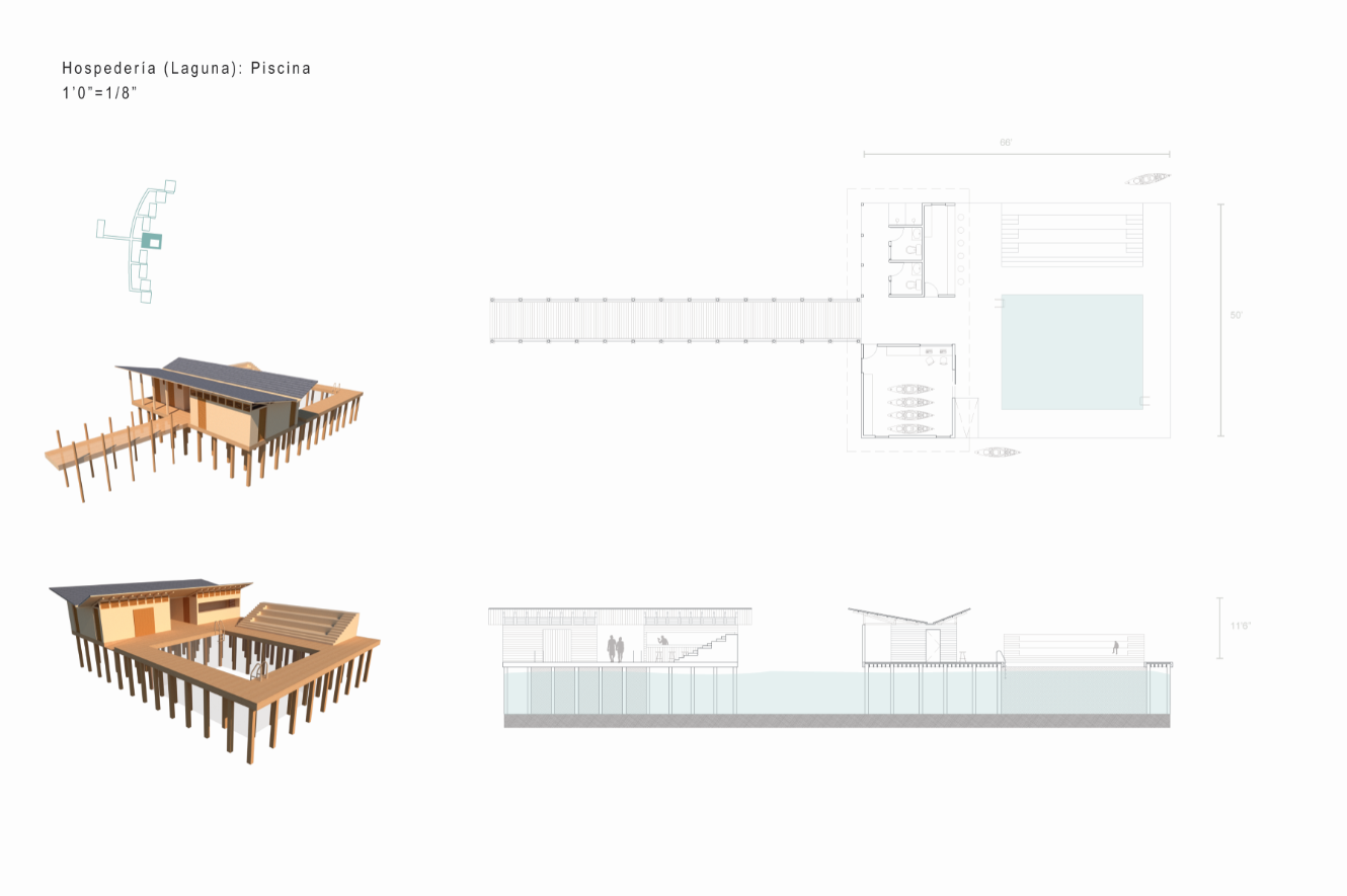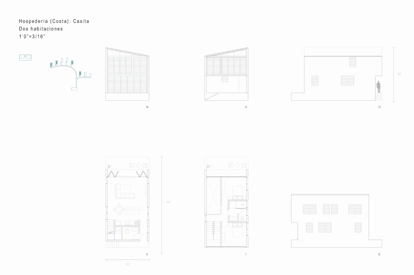 With the intention of proposing spaces that would entice tourists to visit the coastal town of Loíza in Puerto Rico and explore its natural wonders, I designed two short-term lodging projects. These Casitas can be rented out to tourists who want to experience nature up-close, and are accompanied by natural pools. The first project sits deep in the Piñones Mangrove Forest, where wooden tiny houses are floating anchored to a dock at the Piñones Lagoon, where visitors can kayak right from their front deck. The second project is located right on the north coast in Punta Maldonado, where minimalist concrete two level houses overlook the ocean, and a pool area is found right on the water.