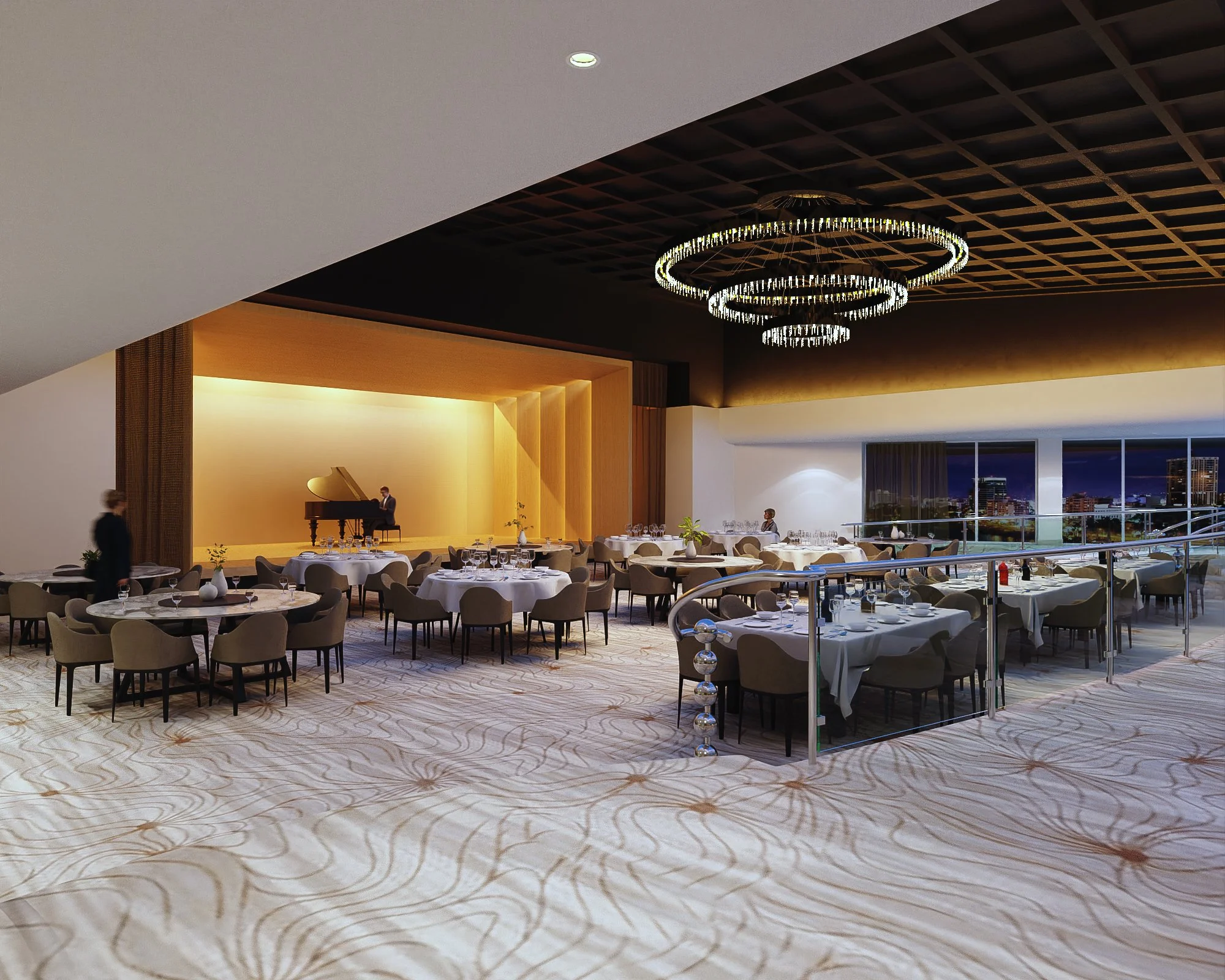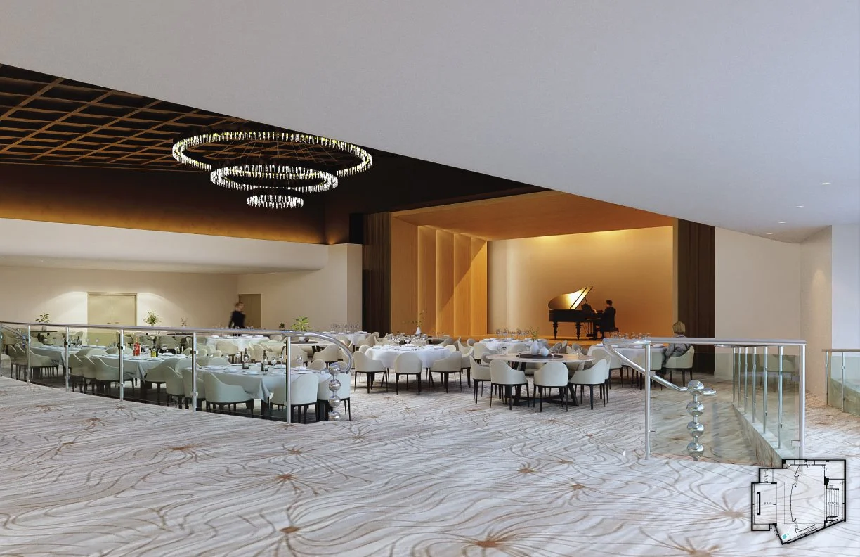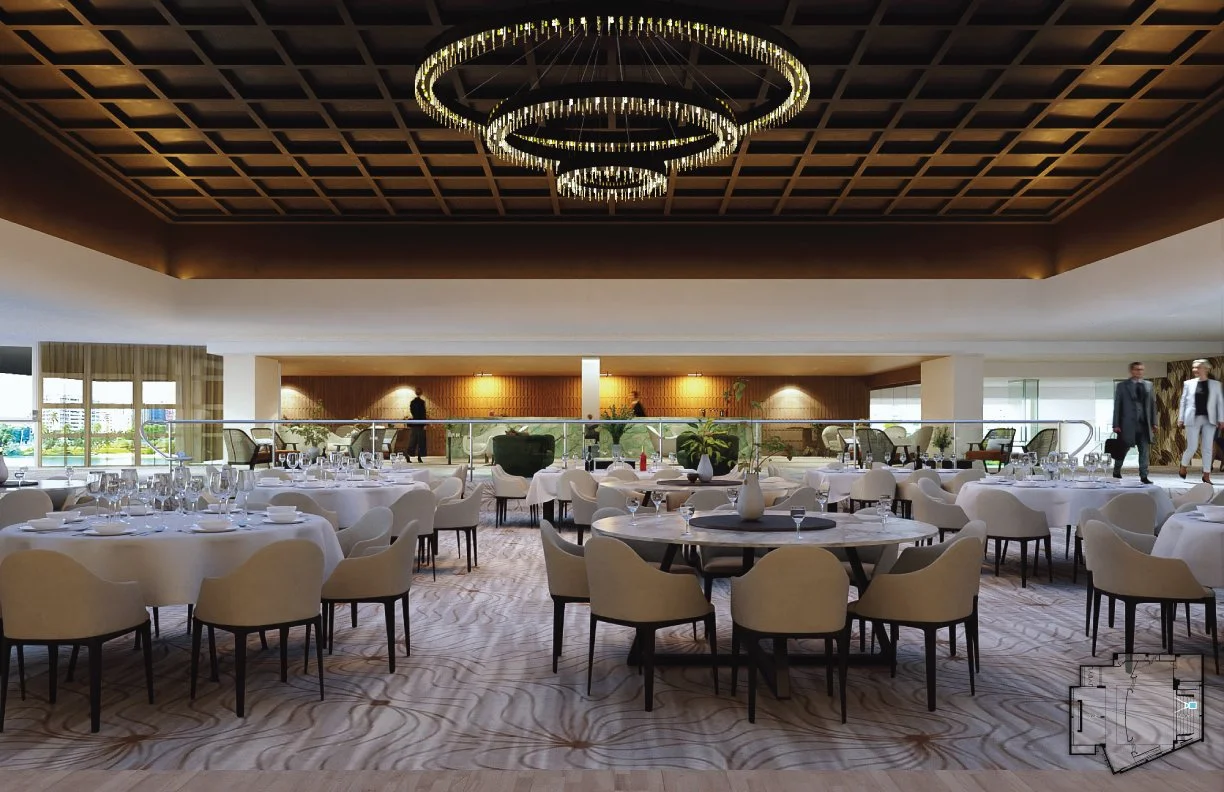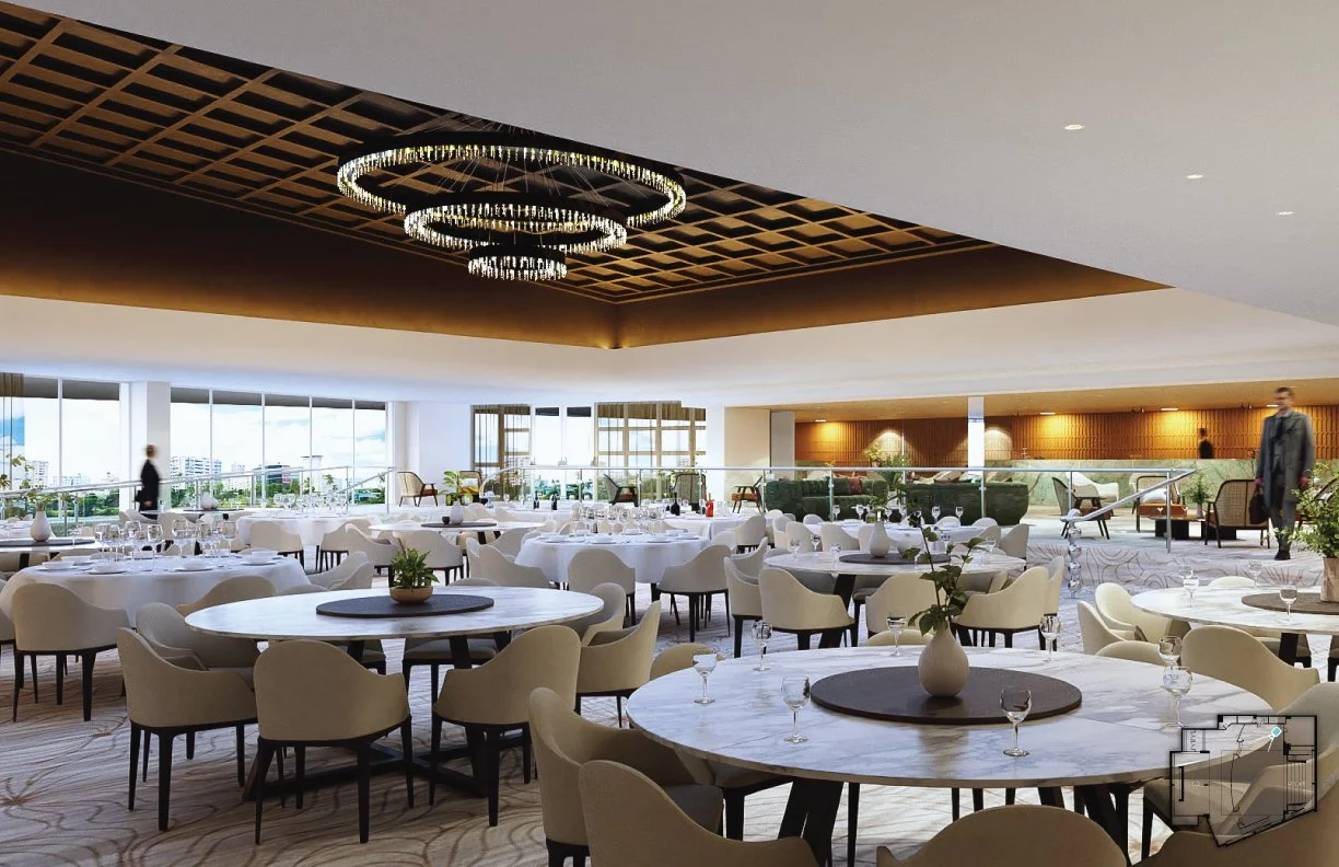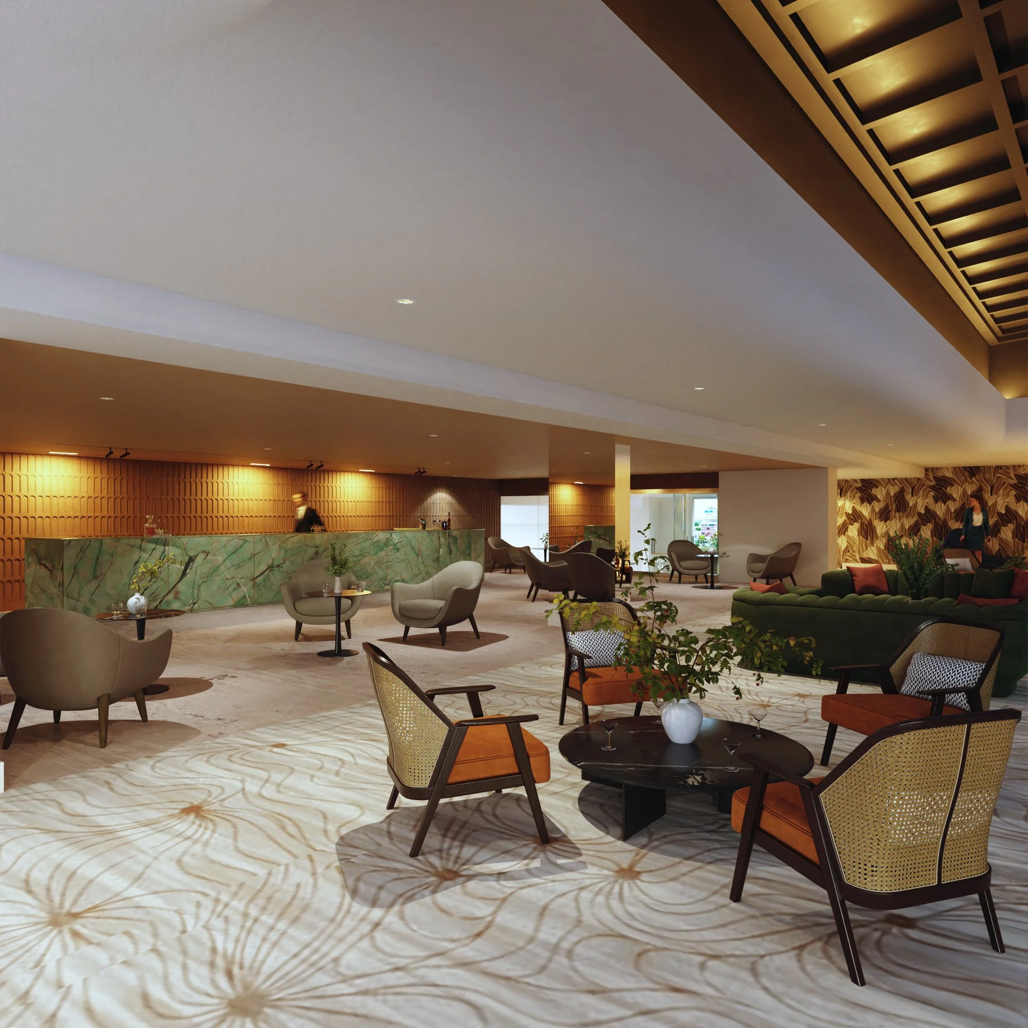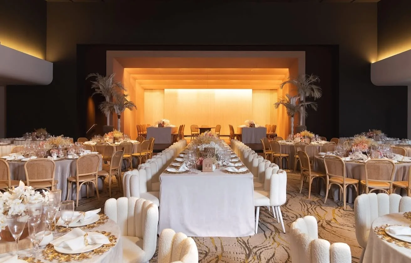 Our office (Design+Development) was tasked with giving a revamp to the ballroom at the Condado Plaza Hotel. A place that, in its current state, was far from the upscale hotspot it was decades ago. Once the epitome of old-school Caribbean glamour, we aimed to revive that essence while remaining palatable for the modern age and neutral enough to serve as a blank canvas for a variety of events. The project consists of an elegant yet simple wooden shell-like stage, a dark coat over the coffered center ceiling to highlight the existing chandelier, an open layout with a light-colored carpet, and a darker, cozy lounge with a throwback solid natural green stone bar. This, along with other design choices, such as accent colors, tropical wallpaper, and local art (such as a Materia Madura coffee residue made panels art piece), helped restore its tropical charm and elegance while remaining apt for a bevy of uses.