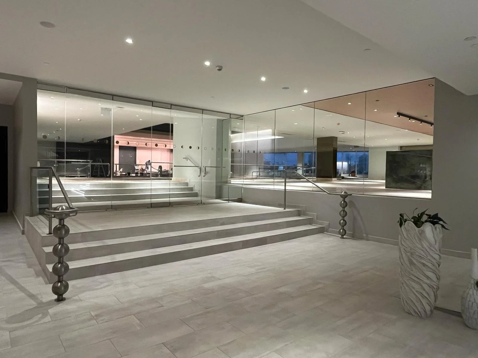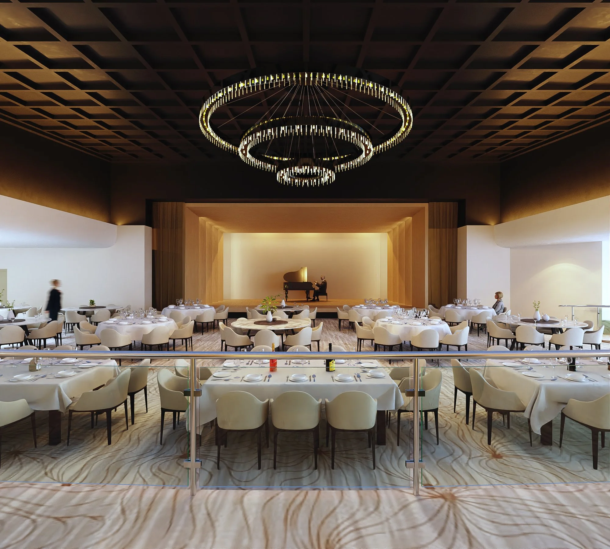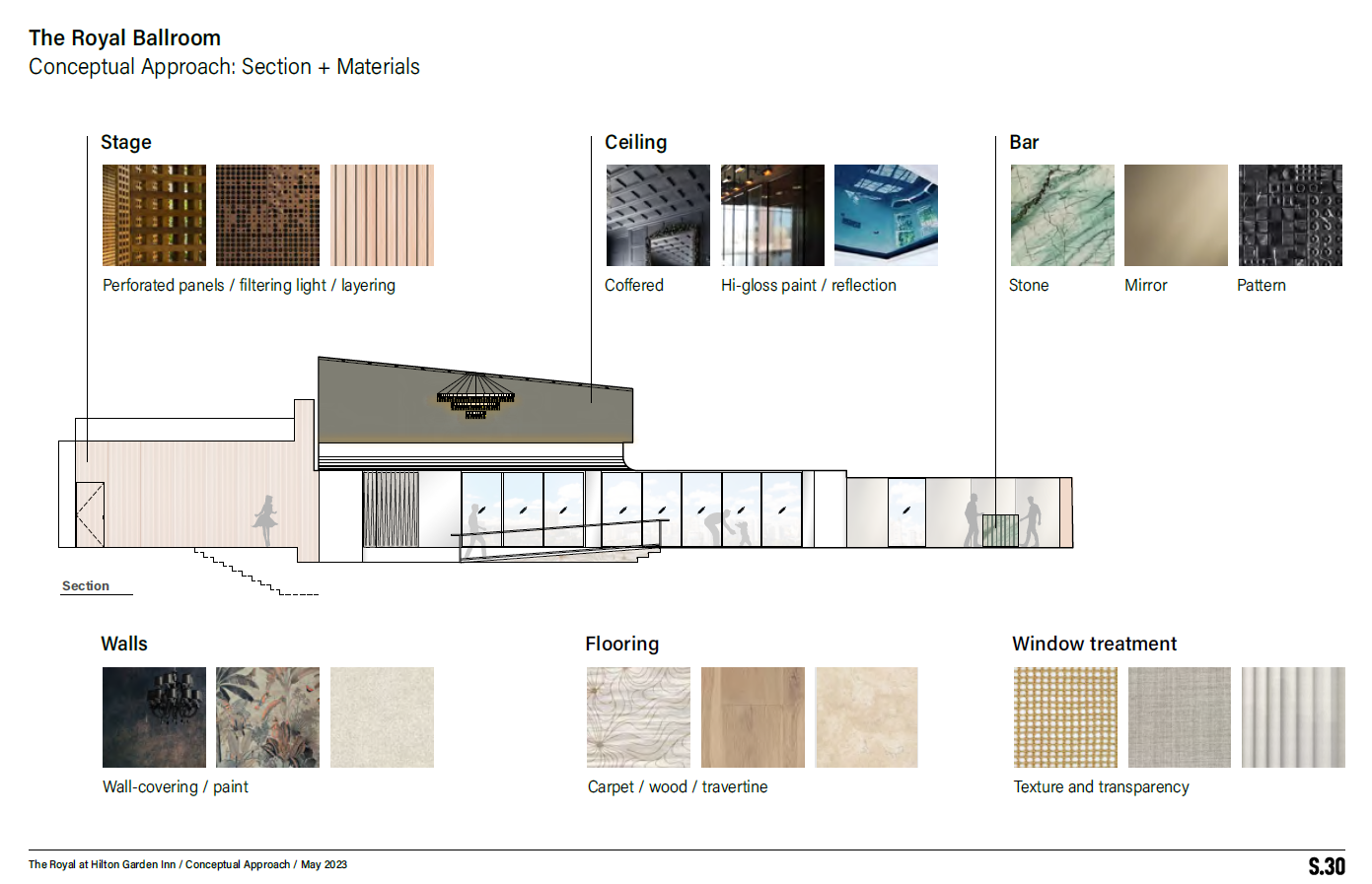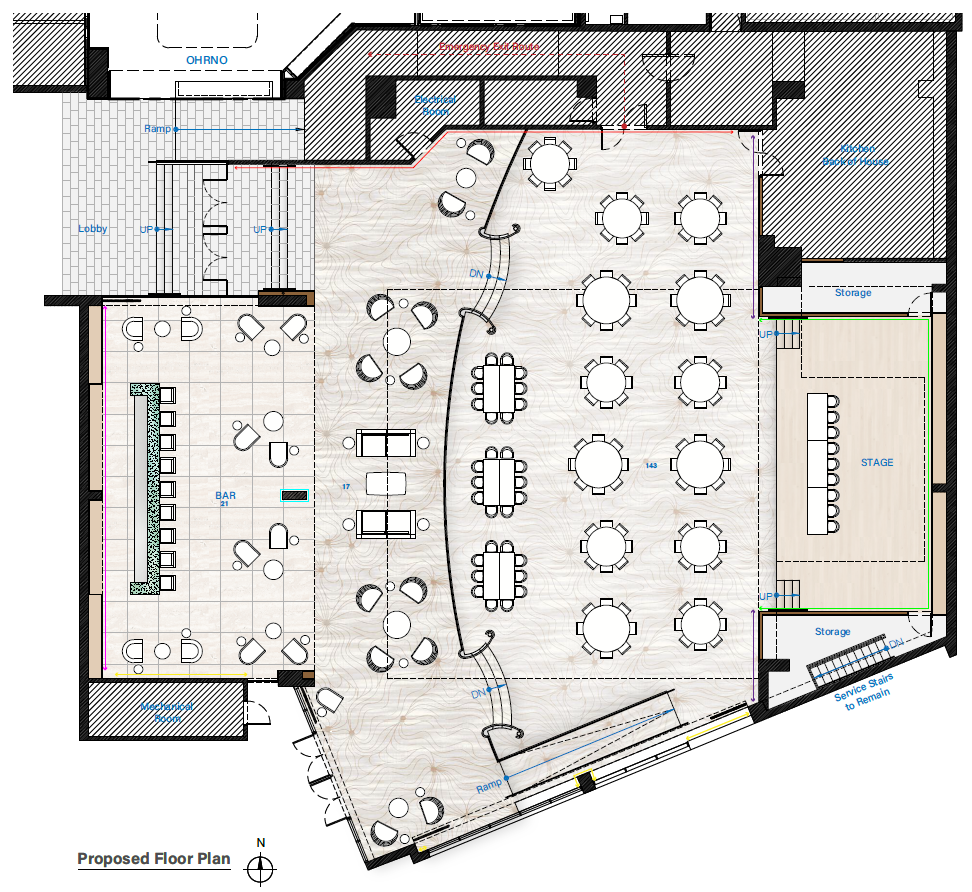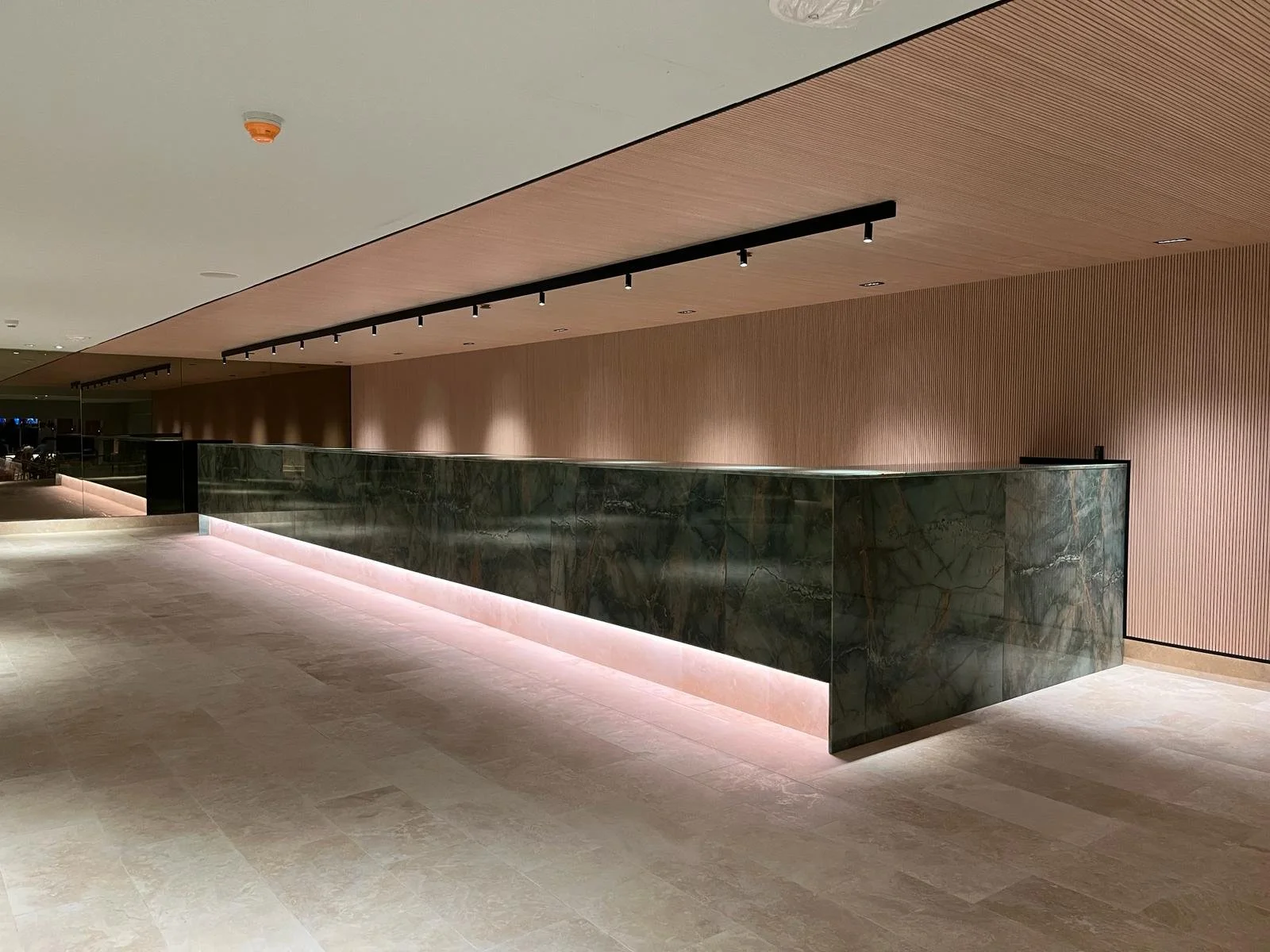 Our office (Design+Development) was tasked with giving a revamp to the ballroom at the Condado Plaza Hotel. A place that, in its current state, was far from the upscale hotspot it was decades ago. Once the epitome of old-school Caribbean glamour, we aimed to revive that essence while remaining palatable for the modern age and neutral enough to serve as a blank canvas for a variety of events. The project consists of an elegant yet simple wooden shell-like stage, a dark coat over the coffered center ceiling to highlight the existing chandelier, an open layout with a light-colored carpet, and a darker, cozy lounge with a throwback solid natural green stone bar. This, along with other design choices, such as accent colors, tropical wallpaper, and local art (such as a Materia Madura coffee residue made panels art piece), helped restore its tropical charm and elegance while remaining apt for a bevy of uses.