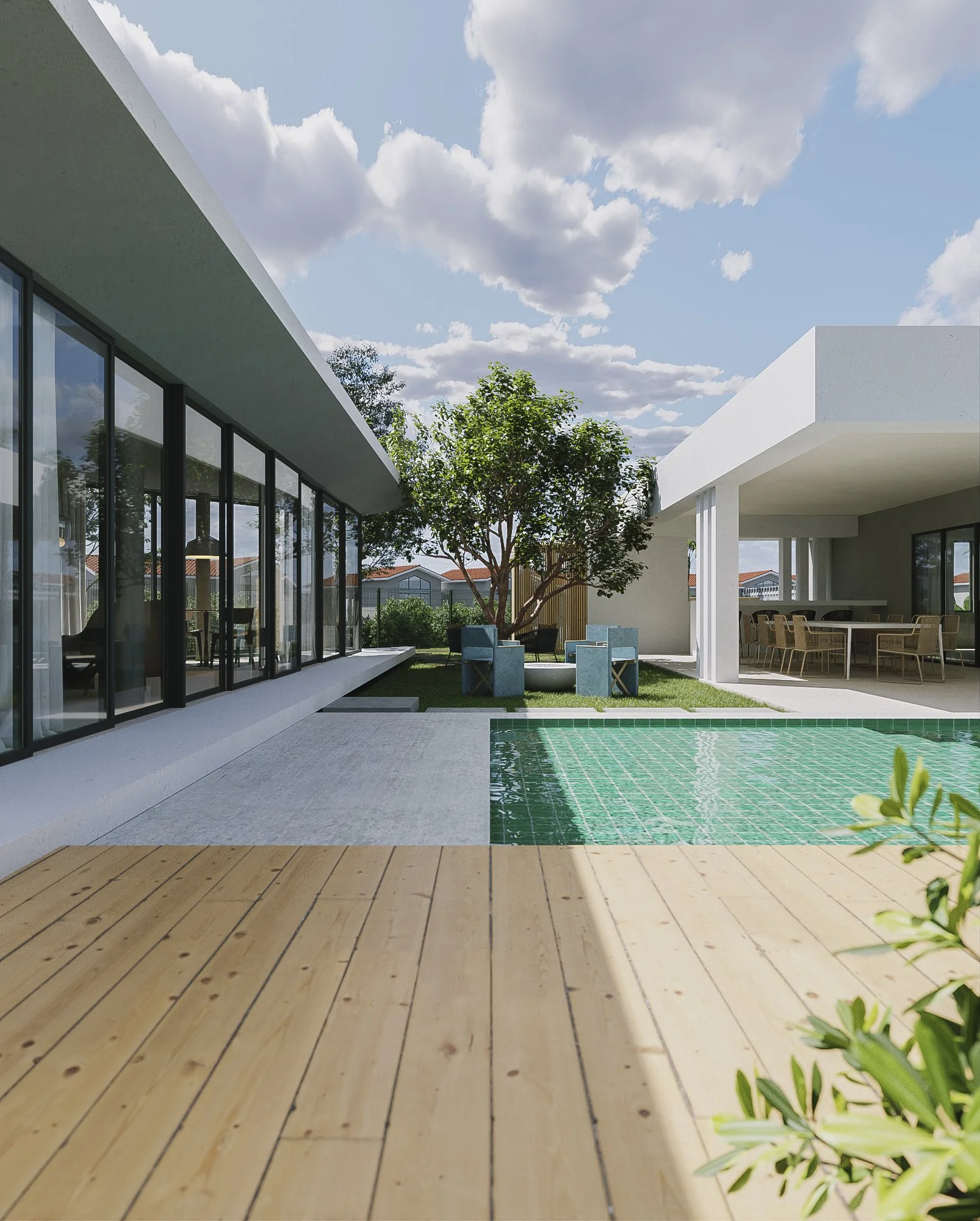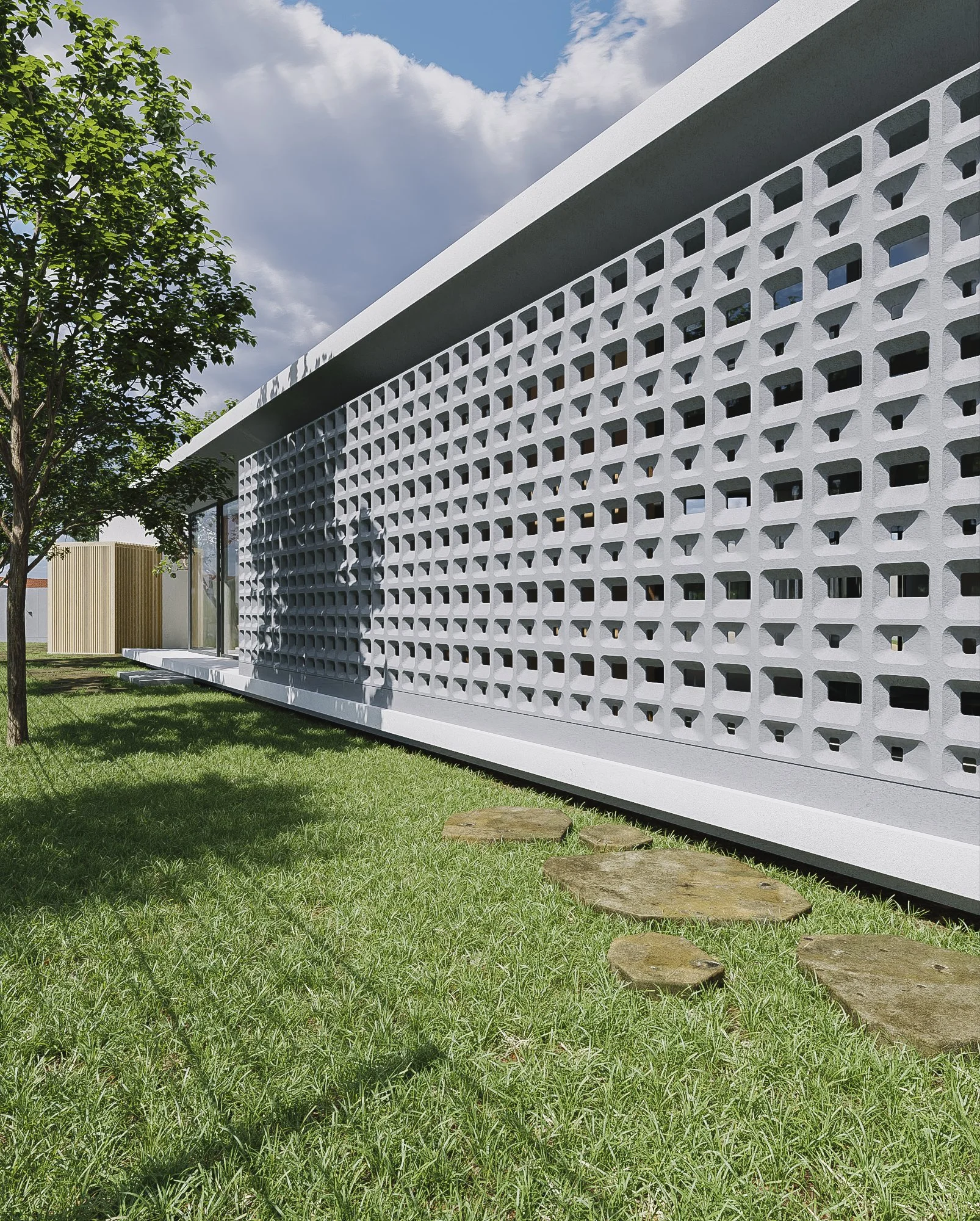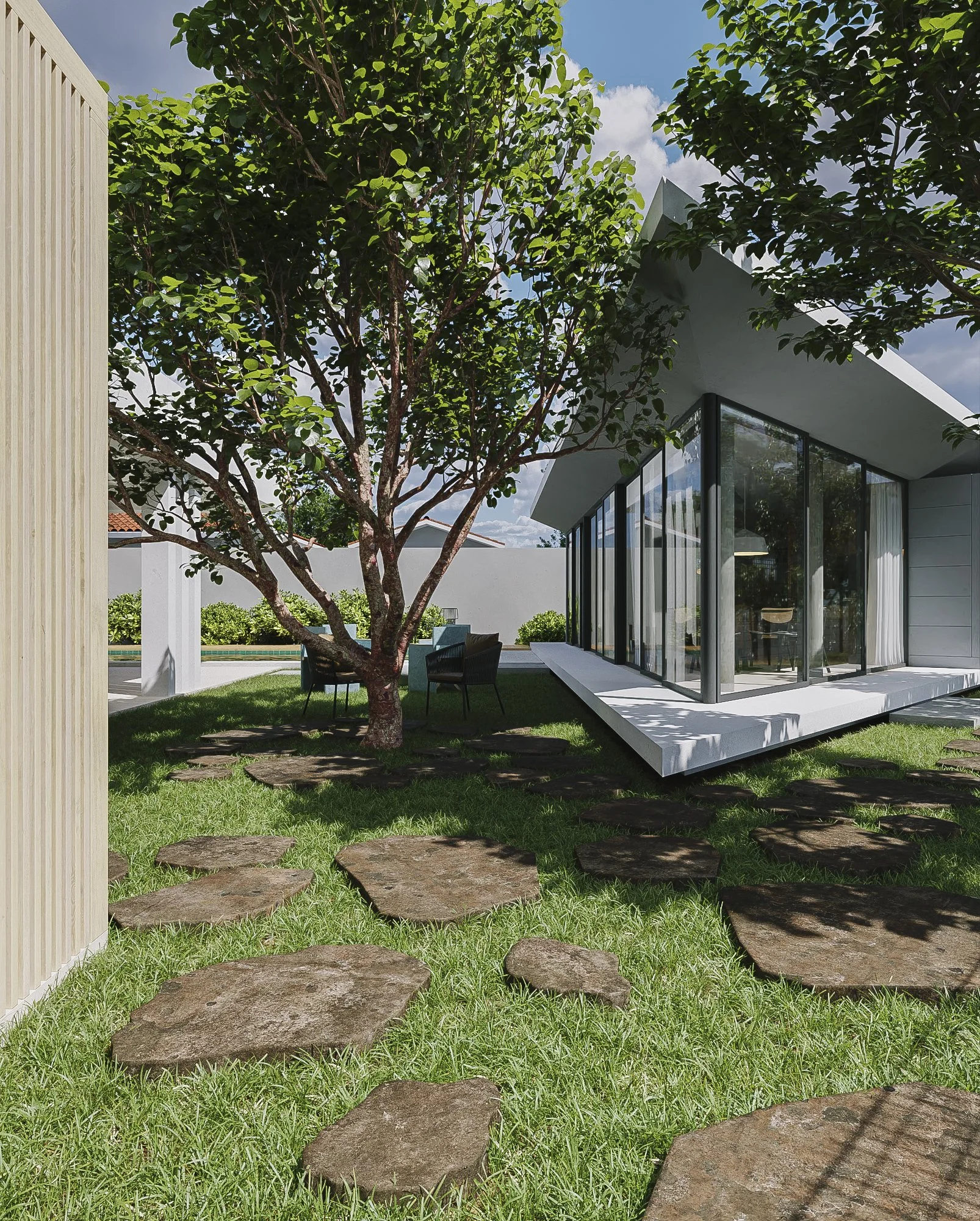 A new terrace was proposed for this house in the Sabanera area in Dorado. The terrace connects to the existing garage area of the house. It’s a raised platform with a pool that connects to a new structure that would function as a gym/office. The pathway to the back patio was also designed with some ornamental walls and pavers to delimit the entryway. The transition from the existing structure to the new one, and its scale, was designed to integrate our proposal as smoothly as possible with what was already there.