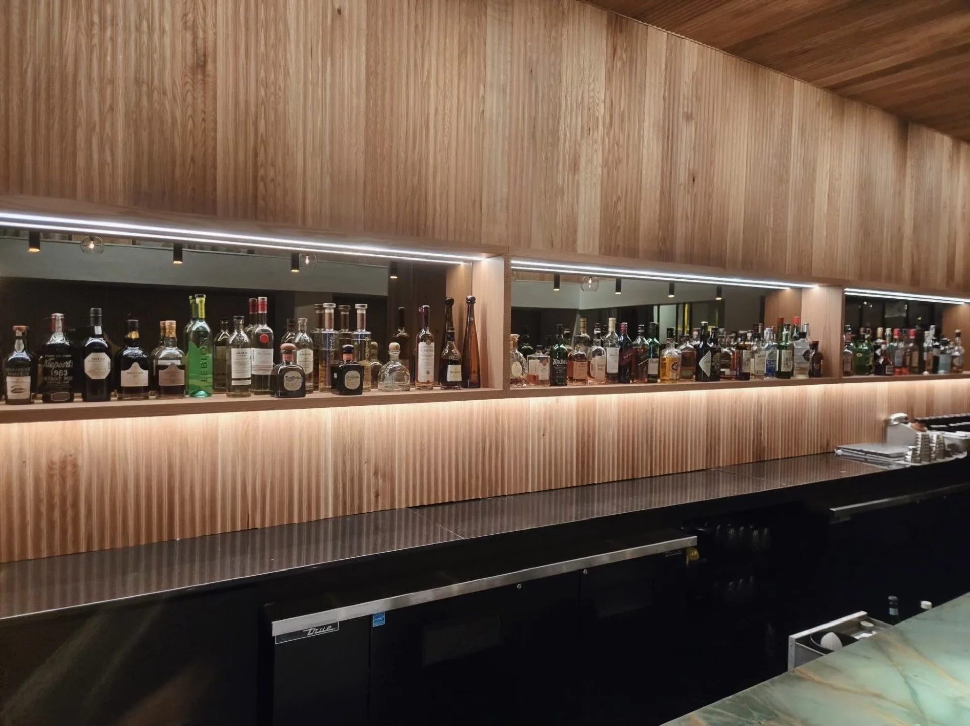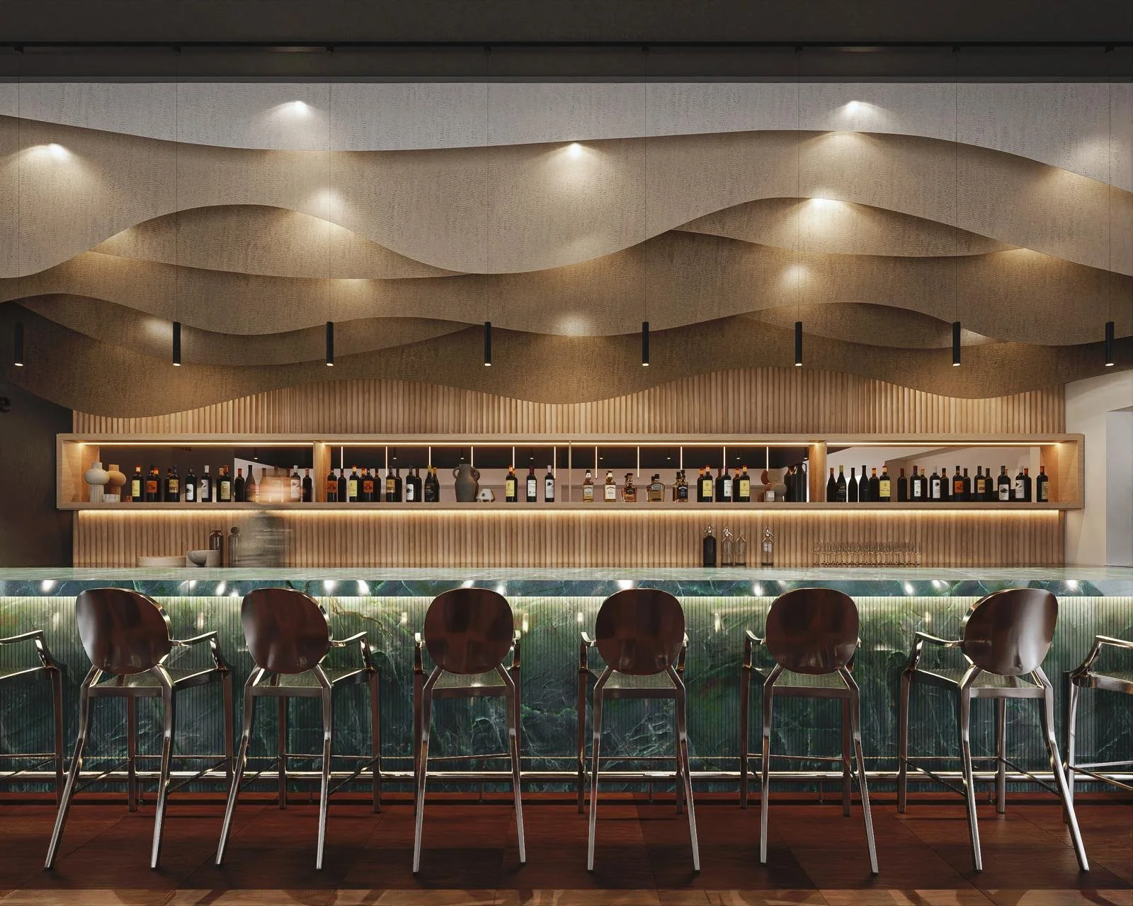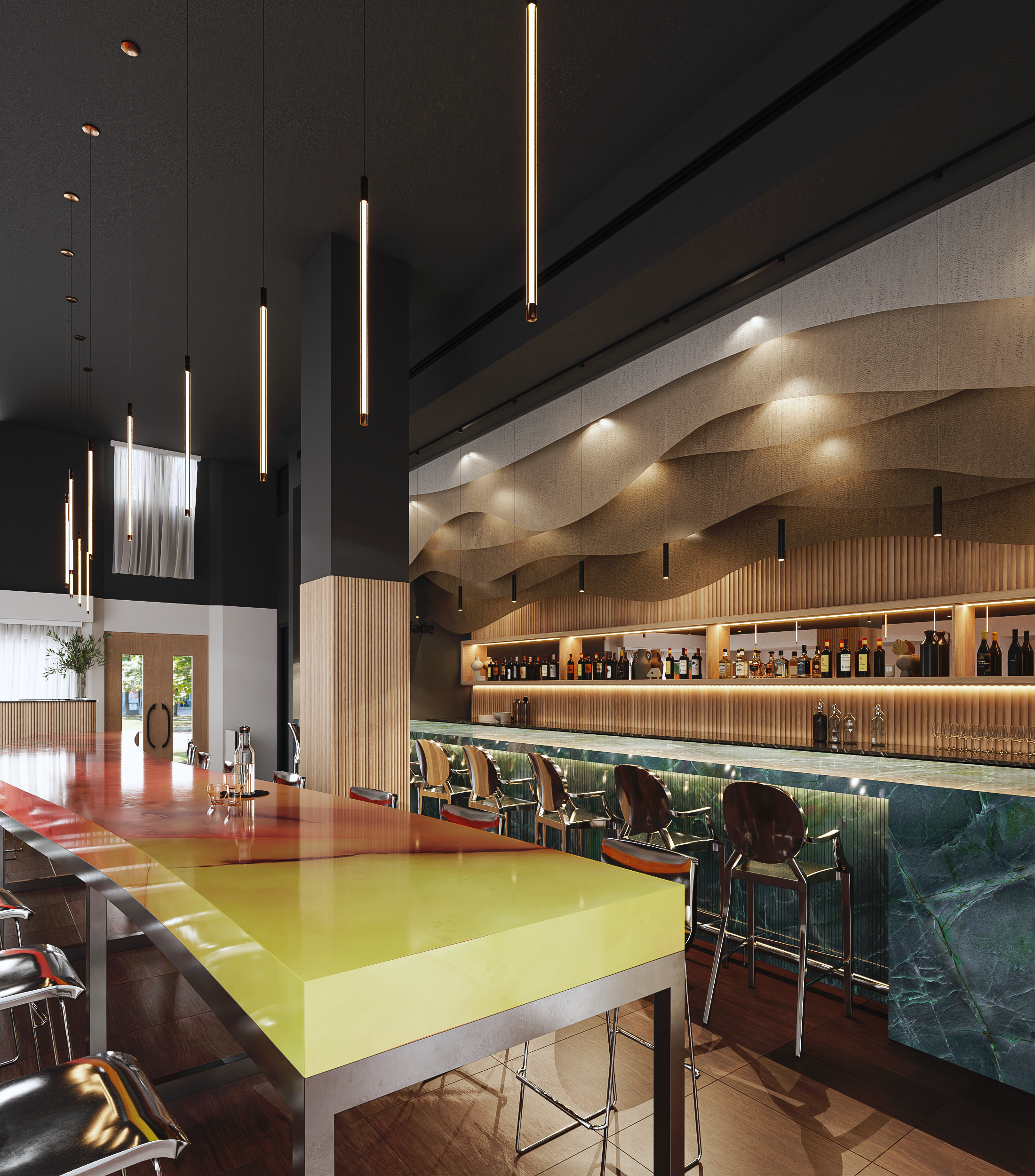 Architect Ruddy Hernández and I worked on a proposed renovation for the bar area in the high-end restaurant Marmalade in Old San Juan. It was in need of an update to reach the sophistication of the rest of the restaurant. The owner already had a color palette selected and had comision for some drappery for the top of the bar. We designed the new bar and the back of the bar. We chose an exotic green stone for the bar that fit the chosen color scheme and the eccentricity of the restaurant. For the back bar, we designed a display made of walnut wood and with a bronze mirror in the back. We also covered the closest column to the bar in the same materials, and we designed the host station millwork. We chose minimal back spotlights for the above bar lighting to keep the dimness the area currently had. All in all, we find that the renovation cleaned up the space, kept a minimal aesthetic, but with strong material choices that kept in harmony with the restaurants style.